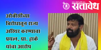 Team Sattavedh OBC leader alleges that Jarange is leading Maharashtra towards anarchy : जरांगे महाराष्ट्राला अराजकतेकडे नेत आहेत, ओबीसी नेत्यांची टीका Akola देशात संविधान आणि कायदा हे सर्वोच्च आहेत. आरक्षणाची मागणी करण्याचा अधिकार सर्वांना आहे; मात्र झुंडशाहीच्या बळावर, मुख्यमंत्र्यांना वेठीस धरून किंवा मुंबईतील चाकरमान्यांना अडवून दादागिरी करणे चुकीचे आहे, असे मत ओबीसी नेते प्रा. लक्ष्मणराव … Continue reading Laxman Hake : ओबीसींच्या विरोधातून राज्य अस्थिर करण्याचा प्रयत्न, प्रा. हाके यांचा आरोप