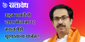Team Sattavedh BJPs demand, but determination to hold melava at Shivtirth : भाजपची मागणी, मात्र शिवतीर्थावरच मेळाव्याचा ठाम निर्धार Mumbai : येत्या २ ऑक्टोबरला शिवाजी पार्कवर होणाऱ्या ठाकरे गटाच्या दसरा मेळाव्याबाबत आता राजकीय वादळ उठले आहे. राज्यातील पुरपरिस्थिती आणि शेतकऱ्यांच्या हालअपेष्टांच्या पार्श्वभूमीवर हा मेळावा रद्द करून त्या खर्चाची रक्कम पुरग्रस्तांना द्यावी, अशी मागणी भाजपकडून करण्यात … Continue reading Dussehra melava : उद्धव ठाकरेंनी दसरा मेळावा रद्द करून पैसे पुरग्रस्तांना द्यावेत !