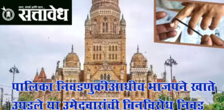 Team Sattavedh Two BJP nominees declared elected unopposed before elections : विरोधकांनी उमेदवारच दिला नाही; मुंबई व कल्याण-डोंबिवलीत विजय Mumbai मुंबई आणि कल्याण-डोंबिवली महानगरपालिका निवडणुकीत काही प्रभागांमध्ये बिनविरोध निवड झाल्याची महत्त्वाची घडामोड समोर आली आहे. या निवडणुकीत विरोधकांना उमेदवार उभा करता आला नाही आणि त्यामुळे भाजपच्या तसेच महायुतीच्या उमेदवारांचा विजय निश्चित झाला. मुंबई महापालिकेच्या वार्ड … Continue reading Municipal Corporation Elections : पालिका निवडणुकीआधीच भाजपने खाते उघडले; या उमेदवारांची बिनविरोध निवड