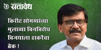 Team Sattavedh Sanjay Raut political move direct flight held in Ward 107 of Mulund : संजय राऊतांची राजकीय चाल, मुलुंडच्या वॉर्ड १०७ मध्ये रंगणार थेट लढत Mumbai : मुंबई महानगरपालिका निवडणुकीच्या पार्श्वभूमीवर मुलुंडमधील वॉर्ड क्रमांक १०७ मध्ये राजकीय नाट्य घडले असून भाजप नेते किरीट सोमय्या यांचे पुत्र नील सोमय्या यांच्या बिनविरोध विजयाच्या शक्यतेला शिवसेना ठाकरे … Continue reading Bmc elections : किरीट सोमय्यांच्या मुलाच्या बिनविरोध विजयाला ठाकरेंचा ब्रेक !