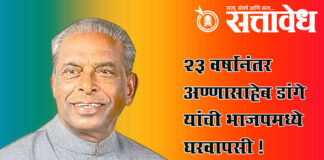 Team Sattavedh Senior leader returns in BJP after 23 years: पश्चिम महाराष्ट्रातील राजकीय समीकरणांमध्ये महत्त्वाचे पाऊल Mumbai : सांगली जिल्ह्यातील ज्येष्ठ नेते आणि माजी मंत्री अण्णासाहेब डांगे यांनी अखेर 23 वर्षांनंतर भारतीय जनता पक्षात पुन्हा प्रवेश केला आहे. मुख्यमंत्री देवेंद्र फडणवीस आणि प्रदेशाध्यक्ष रविंद्र चव्हाण यांच्या उपस्थितीत डांगे यांच्यासह त्यांचे सुपुत्र चिमण डांगे आणि विश्वनाथ … Continue reading Annasaheb Dange : 23 वर्षांनंतर अण्णासाहेब डांगे यांची भाजपमध्ये घरवापसी !