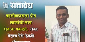 Team Sattavedh Tehsildar caught taking a bribe of two lakh : अकाेल्याच्या एसीबी पथकाची बुलढाण्यात कारवाई, शेतजमीनीचा वर्ग बदलण्यासाठी मागितले एकरी ५० हजारांची लाच Buldhana शेतजमीनीचा वर्ग बदलण्यासाठी दाेन लाख रुपयांची लाच घेतांना माेताळ्याचे तहसीलदार हेमंत भागवत पाटील यांना अकाेल्याच्या लाच लुचपत प्रतिबंधक विभागाच्या (एसीबी)पथकाने १४ सप्टेंबर राेजी रंगेहाथ पकडले. बुलढाणा शहरातील लक्ष्मीनगर स्थिती … Continue reading Anti curroption bureau: तहसीलदाराला दाेन लाखांची लाच घेताना पकडले, शंका येताच पैसे फेकले शाैचालयात