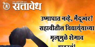 Team Sattavedh Shegaon shaken by the death of a sixth-grade student : दोन दिवसांपूर्वी होता आजारी, ताप मेंदूमध्ये गेला Khamgao संत गजानन महाराजांच्या पावन नगरी शेगावमधून ११ एप्रिलला आलेली बातमी संपूर्ण जिल्ह्याला हादरवून गेली. संस्कार सोनटक्के (वय ११) या सहावीत शिकणाऱ्या विद्यार्थ्याच्या उष्माघाताने मृत्यू झाल्याची चर्चा शेगावात मोठ्या प्रमाणात सुरू झाली होती. मात्र, आरोग्य … Continue reading Buldhana incident : उष्माघात नव्हे, मेंदूज्वर? सहावीतील विद्यार्थ्याच्या मृत्यूमुळे शेगाव हादरलं!