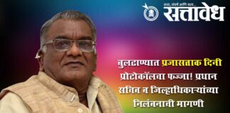 Team Sattavedh Demand for suspension of the Principal Secretary and the District Collector : पालकमंत्र्यांची दांडी, केंद्रीय मंत्र्यांना डावलले; माजी राज्यमंत्र्यांची राज्यपालांकडे तक्रार Buldhana २६ जानेवारी २०२६ रोजीच्या प्रजासत्ताक दिनानिमित्त बुलढाणा जिल्ह्यात झालेल्या नियोजनाच्या अभावावरून मोठा राजकीय वाद पेटला आहे. जिल्ह्याच्या मुख्य शासकीय ध्वजारोहण कार्यक्रमात प्रशासनाने सर्व नियम आणि शिष्टाचार धाब्यावर बसवल्याचा आरोप करत, माजी … Continue reading Buldhana Protocol Row : बुलढाण्यात प्रजासत्ताक दिनी ‘प्रोटोकॉल’चा फज्जा! प्रधान सचिव व जिल्हाधिकाऱ्यांच्या निलंबनाची मागणी