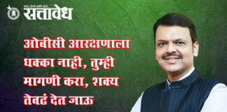 Team Sattavedh Chief Minister Devendra Fadnavis has faith in the OBC community : मुख्यमंत्री देवेंद्र फडणवीसांचा ओबीसी समाजाला विश्वास Satara : “ओबीसी समाजाला मुख्य प्रवाहात आणल्याशिवाय त्यांचा विकास होणार नाही. ओबीसींच्या विकासासाठी सरकार कटिबद्ध आहे आणि त्यांच्या मागण्या पूर्ण करण्यासाठी आम्ही शक्य तेवढे प्रयत्न करू. मराठा आरक्षण देताना देखील ओबीसींच्या हक्काला धक्का लागणार नाही,” असे … Continue reading CM assurance : ओबीसी आरक्षणाला धक्का नाही, तुम्ही मागणी करा, शक्य तेवढं देत जाऊ