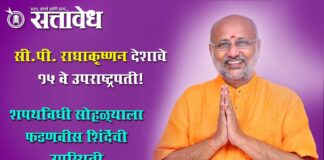 Team Sattavedh Fadnavis Shindes presence at the oath-taking ceremony : शपथविधी सोहळ्याला फडणवीस शिंदेंची उपस्थिती New Delhi : देशाचे १५ वे उपराष्ट्रपती म्हणून चंद्रपुरम पोनुस्वामी (सी.पी.) राधाकृष्णन यांनी शुक्रवारी पदाची शपथ घेतली. राष्ट्रपती भवनात झालेल्या या सोहळ्यात राष्ट्रपती द्रौपदी मुर्मू यांनी त्यांना पद आणि गोपनीयतेची शपथ दिली. या सोहळ्याला महाराष्ट्रातून मुख्यमंत्री देवेंद्र फडणवीस आणि उपमुख्यमंत्री … Continue reading CPRadhakrishnan : सी.पी. राधाकृष्णन देशाचे १५ वे उपराष्ट्रपती!