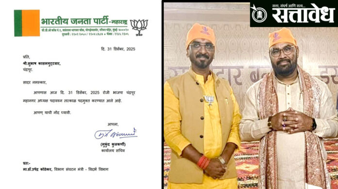 Chandrapur : महापालिका निवडणुकीच्या तोंडावर चंद्रपूर भाजपमध्ये अखेर मोठी शिस्तभंगाची कारवाई झाली असून चंद्रपूर महानगर भाजप अध्यक्ष सुभाष कासनगोटूवार यांची तात्काळ पदावरून हकालपट्टी करण्यात आली आहे. भाजप महाराष्ट्र प्रदेश कार्यालय सचिव मुकुंद कुलकर्णी यांच्या सहीने आज, ३१ डिसेंबर २०२५ रोजी कासनगोटूवार यांना अधिकृत पत्र पाठवण्यात आले असून त्यामध्ये आपणास आजपासून चंद्रपूर महानगर अध्यक्षपदावरून पदमुक्त करण्यात येत असल्याचे स्पष्ट करण्यात आले आहे. या पत्राची प्रत विदर्भ विभाग संघटन मंत्री डॉ. उपेंद्र कोठेकर यांनाही पाठवण्यात आली आहे.