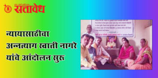 Team Sattavedh Farmer’s widow protests against the government : सरकारचे आश्वासन हवेत; झुंजार शेतकरी मंचचा पाठींबा Buldhana अंढेरा परिसरातील जलसिंचनाच्या मागणीसाठी बलिदान दिलेल्या युवा शेतकरी कैलास अर्जुन नागरे Kailash Nagare यांच्या पत्नी स्वाती नागरे यांनी, प्रशासनाच्या वचनभंगाविरोधात आजपासून शिवणी आरमाळ येथे पतीच्या प्रतिमेजवळ अन्नत्याग आंदोलन सुरू केले आहे. १३ मार्च रोजी केलेल्या बलिदानानंतर मुख्यमंत्री देवेंद्र … Continue reading Farmers suicide : न्यायासाठीचा अन्नत्याग; स्वाती नागरे यांचे आंदोलन सुरू