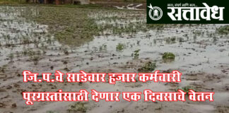 Team Sattavedh 4,500 Zilla Parishad Employees to Donate One Day’s Salary for Flood Victims : बुलढाणा जिल्ह्याची राज्यभर चर्चा, युनियनने घेतला Buldhana अतिवृष्टी व पुरामुळे राज्यभरातील शेतकरी मोठ्या आर्थिक संकटात सापडला आहे. शेतकरी व आपद्ग्रस्तांना सावरण्यासाठी हजारो कोटी रुपयांच्या निधीची आवश्यकता आहे. राज्य शासनाने केलेल्या आवाहनाला प्रतिसाद देत महाराष्ट्र राज्य जिल्हा परिषद कर्मचारी युनियनच्या बुलढाणा … Continue reading Heavy rain : जि.प.चे साडेचार हजार कर्मचारी पूरग्रस्तांसाठी देणार एक दिवसाचे वेतन