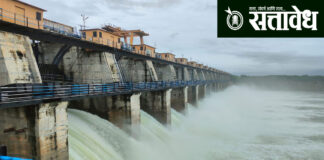 Team Sattavedh Overflows due to heavy rainfall : ५० सेमीने पाण्याचा विसर्ग, जोरदार पावसामुळे प्रकल्प ओव्हर फ्लो Buldhana बुलढाणा जिल्ह्यासह मराठवाड्यात जोरदार पाऊस होत आहे.त्यामुळे धरणाच्या जलसाठ्यात वाढ होत आहे.खडकपूर्णा प्रकल्प १०० टक्के भरला असून सर्वच १९ गेट ५० सेमीने उघडण्यात आले आहेत. त्यामुळे, खडकपूर्णा नदीच्या काठावर असलेल्या ३३ गावांना सतर्कतेचा इशारा देण्यात आला आहे. … Continue reading Khadakpurna Dam : खडकपूर्णा प्रकल्पाचे पुन्हा सर्वच १९ दरवाजे उघडले!