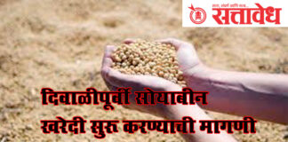 Team Sattavedh Demand to Start Soybean Procurement Before Diwali : दिवाळीपूर्वी सोयाबीन खरेदी सुरू करण्याची मागणी Akola अतिवृष्टीच्या फटक्यात आधीच हतबल झालेल्या शेतकऱ्यांची स्थिती बिकट झाली आहे. त्यातच शासकीय खरेदी केंद्र अद्याप सुरू न झाल्याने व्यापारी अत्यंत कमी दराने सोयाबीन खरेदी करत आहेत. राज्य सरकारने दिवाळीपूर्वी शासकीय खरेदी केंद्र सुरू न केल्यास आमदार आणि लोकप्रतिनिधींच्या … Continue reading Kisan Brigade : आमदारांच्या घरांना घेराव घालणार, किसान ब्रिगेडचा इशारा