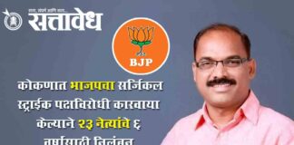 Team Sattavedh 23 leaders suspended for six years for anti-party activities : जिल्हा परिषद व पंचायत समिती निवडणुकीपूर्वी मोठी कारवाई; बंडखोरांना आणि विरोधकांच्या समर्थकांना डच्चू; प्रभाकर सावंत यांचा कडक इशारा Sindhudurg आगामी जिल्हा परिषद आणि पंचायत समिती निवडणुकीच्या पार्श्वभूमीवर भारतीय जनता पक्षाने कोकणात शिस्तीचा बडगा उगारला आहे. पक्षाच्या अधिकृत उमेदवारांविरुद्ध बंडखोरी करणाऱ्या आणि पक्षविरोधी कारवायांमध्ये … Continue reading Konkan Bjp : कोकणात भाजपचा ‘सर्जिकल स्ट्राईक’; पक्षविरोधी कारवाया केल्याने २३ नेत्यांचे ६ वर्षांसाठी निलंबन