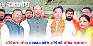 Team Sattavedh Big blow to Congress; State Congress Secretary Rajabhau Tidke joins BJP : स्थानिक स्वराज्य निवडणुकांपूर्वी भाजपची मोठी चल, भाजपकडून काँग्रेसचे कंबरडे मोडण्याची रणनीती वेगात Nagpur स्थानिक स्वराज्य संस्थांच्या निवडणुकांची चाहूल लागताच नागपूरच्या राजकीय पटलावर मोठी हलचाल दिसू लागली आहे. काँग्रेसला मोठा धक्का देत पक्षाचे सचिव प्रसन्ना (राजाभाऊ) तिडके, माजी शहराध्यक्ष दिलीप सिरसाम, महिला … Continue reading Local Body Elections : काँग्रेसला मोठा धक्का; प्रदेश काँग्रेसचे सचिव राजाभाऊ तिडके भाजपमध्ये !