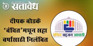 Team Sattavedh Vanchit Bahujan Aghadi leader worked for the Congress; suspended from the party : दीपक बोडके ‘वंचित’मधून सहा वर्षांसाठी निलंबित Akot अकोट नगरपरिषद निवडणुकीत पक्षविरोधी कार्य केल्याचा ठपका ठेवून वंचित बहुजन आघाडीने अकोट येथील पक्षाचे नेते दीपक बोडखे यांच्यावर कारवाई केली आहे. पक्षशिस्तीचा भंग झाल्याचे कारण देत त्यांना सहा वर्षांसाठी पक्षातून निलंबित करण्यात आले … Continue reading Local Body Elections : वंचितच्या नेत्याने काँग्रेससाठी काम केले, कारवाई झाली
