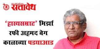 Team Sattavedh The journey of the humorous poetry show Mirza Express has been halted : विनोदी काव्यसादरीकरनाच्या ‘मिर्झा एक्सप्रेस’चा प्रवास थांबला Amravati : महाराष्ट्राचे सुप्रसिद्ध कवी, हास्यसम्राट आणि विनोदी काव्यसादरीकरणाला नवे परिमाण देणारे ‘मिर्झा एक्सप्रेस’ फेम डॉ. मिर्झा रफी अहमद बेग यांचे आज शुक्रवारी सकाळी 6.30 वाजता अमरावती येथे दीर्घ आजाराने निधन झाले. ते 68 … Continue reading Mirza Rafi Baig : ‘हास्यसम्राट’ मिर्झा रफी अहमद बेग काळाच्या पडद्याआड