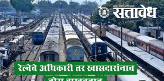 Team Sattavedh Railway officials do not respond to MLAs & MPs : बैठकीत व्यक्त झाला संताप, लोकप्रतिनिधींना प्रतिसाद देत नसल्याचा आरोप Nagpur रेल्वेच्या अधिकाऱ्यांसोबत लोकप्रतिनिधींची बैठक झाली. बैठकीत स्वागताची औपचारिकता पार पडल्यानंतर मात्र वातावरण गरम झाले. लोकप्रतिनिधींपैकी अनेकांनी आपापल्या क्षेत्रातील रेल्वे प्रकल्पाचा विषय मांडला. त्यासंबंधाने काही अडचणी असेल, त्या मार्गी लावायच्या असेल, तर अधिकाऱ्यांकडून सकारात्मक … Continue reading MP & MLA of Nagpur : रेल्वेचे अधिकारी तर खासदारांनाच तोरा दाखवतात