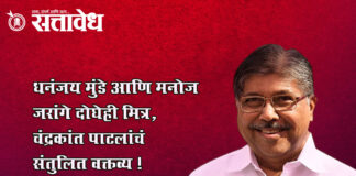 Team Sattavedh Dhananjay Munde and Manoj Jarange both are my friends, Chandrakant Patil’s balanced statement : नेमकं काय झालं माहिती नाही, पण दोघांनाही फोन करून विचारतो Pune : मराठा आरक्षणाच्या पार्श्वभूमीवर सुरू असलेल्या धनंजय मुंडे आणि मनोज जरंगे पाटील यांच्यातील आरोप प्रत्यारोपांच्या फैरींंवर आता राज्याचे उच्च शिक्षण मंत्री चंद्रकांत पाटील यांनी संतुलित प्रतिक्रिया दिली आहे. … Continue reading Munde-Jarange controversy : धनंजय मुंडे आणि मनोज जरांगे दोघेही मित्र, चंद्रकांत पाटलांचं संतुलित वक्तव्य !