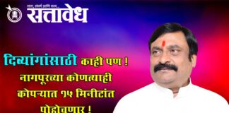 Team Sattavedh NCP city president Prashant Pawar is committed to the welfare of disabled people : ग्रामविकास विभागाच्या निर्णयानंतरही दिव्यांगांना नाही मिळत लाभ Nagpur : नागपूर शहरातील दिव्यांग बांधवांना महानगरपालिका, कुठलीही शासकीय यंत्रणा किंवा आणखी कुणी त्रास देत असेल. कुणी त्यांच्या दुकानांच्या जागांवर अतिक्रमण करत असेल तर त्यांनी तात्काळ कॉल करावा मी १५ मिनीाटांत नागपूरच्या … Continue reading Nationalist Congress Party : दिव्यांगांसाठी काही पण ! नागपूरच्या कोणत्याही कोपऱ्यात १५ मिनीटांत पोहोचणार !