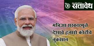 Team Sattavedh Prime Minister Narendra Modi’s attack on the Thackeray government : पंतप्रधान नरेंद्र मोदींचा ठाकरे सरकारवर घणाघात Navi Mumbai : नवी मुंबई आंतरराष्ट्रीय विमानतळाच्या भव्य उद्घाटन सोहळ्यात पंतप्रधान नरेंद्र मोदी यांनी महाराष्ट्राच्या मविआ सरकारवर तीव्र शब्दात हल्ला चढवला. “मविआ सरकारमुळे देशाचे हजारो कोटींचे नुकसान झाले. मुंबईकरांना विकासासाठी चार-पाच वर्षे थांबावे लागले. हे कोणत्याही पापापेक्षा … Continue reading Navi Mumbai Airport : मविआ सरकारमुळे देशाचे हजारो कोटींचे नुकसान