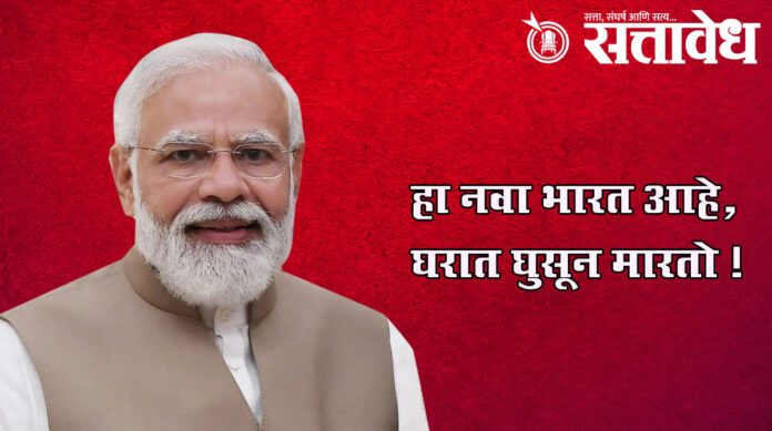 मोदी म्हणाले, “पाकिस्तानातून आलेल्या दहशतवाद्यांनी आमच्या बहिणींचं सिंदूर उजाडलं. त्यानंतर आम्ही ‘ऑपरेशन सिंदूर’ करून दहशतवादी ठिकाणं उद्ध्वस्त केली. आमच्या वीर जवानांनी पाकिस्तानला गुडघ्यावर आणलं. आता कालच जगाने बघितलं की पुन्हा पाकिस्तानी दहशतवादी रडत रडत आपली परिस्थिती सांगत होते. हा नवीन भारत आहे, हा कोणाच्या परमाणू धमकींना भीत नाही.”