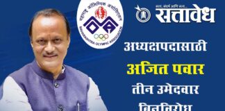 Team Sattavedh Ajit Pawar for the post of President; Three candidates unopposed : महाराष्ट्र ऑलिंपिक असोसिएशनची निवडणुक, विजय निश्चित Mumbai : महाराष्ट्र ऑलिंपिक असोसिएशनच्या निवडणुकीत उपमुख्यमंत्री अजित पवार यांच्या ‘ऑलिंपिक पॅनेल’चा विजय जवळपास निश्चित झाल्याचे स्पष्ट झाले आहे. येत्या रविवारी, म्हणजेच २ नोव्हेंबर रोजी मुंबईत होणाऱ्या महाराष्ट्र ऑलिंपिक असोसिएशनच्या पंचवार्षिक निवडणुकीसाठी अजित पवार गटाचे … Continue reading Olympic Association : अध्यक्षपदासाठी अजित पवार; तीन उमेदवार बिनविरोध