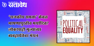 Team Sattavedh political-equality-vs-reality-debate-on-democracy-values : उमेदवारीतील पारदर्शकता, घराणेशाहीचा मुद्दा अन् लोकशाही; ‘सत्तावेध’ विश्लेषण Mehkar स्वातंत्र्योत्तर ७५ वर्षांच्या प्रवासात आपण राजकीय, आर्थिक आणि सामाजिक समतेचे उद्दिष्ट ठेवले असले, तरी सद्यस्थितीत ‘राजकीय समता’ ही संकल्पना प्रत्यक्ष व्यवहारात कितपत उतरली आहे, यावर आता सार्वजनिक चर्चा सुरू झाली आहे. अलीकडेच एका परिषदेत या विषयावर मांडण्यात आलेल्या विचारांमुळे राजकीय वर्तुळात आणि … Continue reading Politics democracy values : ‘राजकीय समता’ केवळ भाषणापुरतीच मर्यादित? लोकशाही मूल्यांच्या व्यवहार्यतेवर मंथन