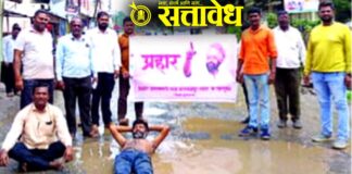 Team Sattavedh A protest by sleeping in potholes against the poor condition of the road : नागरिकांच्या सोयीसुविधांकडे दुर्लक्ष करीत असल्याचा आरोप Malkapur शहरातील रस्त्यांवरील खड्ड्यांमुळे नागरिक त्रस्त असून नवरात्रोत्सव तोंडावर असताना भाविकांच्या सुरक्षिततेचा प्रश्न गंभीर बनला आहे. तरीदेखील नगरपरिषद प्रशासनाने दुर्लक्ष केल्याने अखेर प्रहार जनशक्ती पक्षाने अनोखे आंदोलन करत प्रशासनासह लोकप्रतिनिधींवर निशाणा साधला. जिल्हा … Continue reading Prahar Janshakti Party : खड्ड्यात झोपून प्रहारचे आंदोलन, सरकारवर टीका