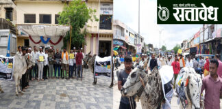 Team Sattavedh Black bull protest by Farmer’s Organization : अनोख्या आंदोलनाने वेधले महाराष्ट्राचे लक्ष, संपूर्ण कर्जमाफीची मागणी Akola महाराष्ट्र सरकारच्या धोरणांविरोधात आणि शेतकऱ्यांच्या प्रलंबित मागण्यांसाठी क्रांतिकारी शेतकरी संघटनेतर्फे काळा बैल पोळा धरने आंदोलन शुक्रवारी, २२ ऑगस्ट रोजी सकाळी ११ वाजता मुर्तीजापूर तहसील कार्यालयासमोर केले. या आंदोलनात संघटनेचे जिल्हाध्यक्ष चंद्रशेखर गवळी यांच्या नेतृत्वाखाली मोठ्या संख्येने शेतकरी … Continue reading Protest for loan waiver : शेतकऱ्यांच्या हक्कांसाठी ‘काळा बैल पोळा’!