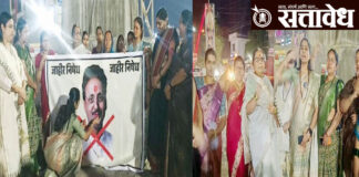 Team Sattavedh BJP mahila aghadi protest against congress leader rahul bondre controversial statement : काँग्रेस नेत्याच्या वक्तव्यावरून राजकारण तापले, भाजपा महिला आघाडी आक्रमक Chikhli जिल्हा काँग्रेस कमिटीचे अध्यक्ष तथा माजी आमदार राहुल बोंद्रे यांनी महिलांच्या कुंकू आणि मंगळसूत्र संदर्भात केलेल्या वक्तव्याविरोधात चिखली येथे भाजपा महिला आघाडीने आक्रमक भूमिका घेत तीव्र निषेध नोंदविला. या प्रकरणामुळे शहरातील … Continue reading rahul bondre : राहुल बोंद्रे यांच्या फलकावर चपला मारल्या, महिलांचा रोष