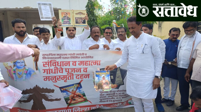 Chikhali विजयादशमी आणि महात्मा गांधी जयंतीच्या निमित्ताने चिखली शहरात जिल्हा काँग्रेस कमिटीच्यावतीने संविधान पूजन व मनुस्मृती दहन कार्यक्रम आयोजित करण्यात आला. या वेळी काँग्रेसचे जिल्हाध्यक्ष राहुल बोंद्रे यांनी “संविधान हे लोकशाहीचा आत्मा असून, मनुस्मृतीने समाजात विषमता, जातिभेद आणि स्त्रीद्वेष रुजवला; तर संविधानाने समानतेचा मार्ग दाखवला,” असे प्रतिपादन केले.