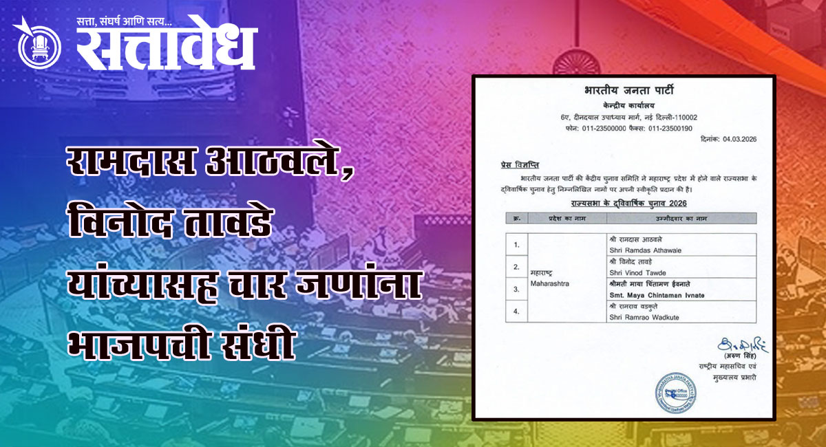 Mumbai : राज्यसभा निवडणूक २०२६च्या पार्श्वभूमीवर भारतीय जनता पार्टीने महाराष्ट्रातील आपल्या चार उमेदवारांची अधिकृत घोषणा केली आहे. रामदास आठवले, विनोद तावडे, माया चिंतामण ईवनाते आणि रामराव वडकुते यांना पक्षाने उमेदवारी बहाल केली असून या निर्णयामुळे राज्याच्या राजकारणात नव्या चर्चांना उधाण आले आहे.