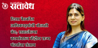 Team Sattavedh raksha-khadse-angry-on-officials-in-disha-meeting-for-pending-works : विसंगत माहिती देणाऱ्या अधिकाऱ्यांची रक्षा खडसेंनी घेतली झाडाझडती Buldhana नेहमी संयमी स्वभावासाठी ओळखल्या जाणाऱ्या केंद्रीय राज्यमंत्री तथा खासदार रक्षा खडसे यांचा एक आक्रमक पैलू नुकत्याच पार पडलेल्या ‘दिशा’ समितीच्या बैठकीत पाहायला मिळाला. जिल्ह्यातील रखडलेल्या विकासकामांचा आढावा घेण्यासाठी आयोजित या बैठकीत, काही विभागांच्या अधिकाऱ्यांनी अपुरी आणि विसंगत माहिती सादर केल्याने वातावरण चांगलेच … Continue reading Raksha Khadse : दिशा बैठकीत अधिकाऱ्यांची बोलती बंद; रखडलेल्या कामांवरून केंद्रीय राज्यमंत्र्यांचा संताप