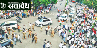 Team Sattavedh Attempt to throw soybeans at the vehicle of the BJP State President : अमरावतीत भाजप-काँग्रेस आमने-सामने, पंचवटी चौकात तणाव Amravati शिक्षक मतदारसंघाच्या पार्श्वभूमीवर आयोजित पदाधिकाऱ्यांच्या बैठकीसाठी भाजपचे प्रदेशाध्यक्ष रवींद्र चव्हाण यांचे शुक्रवारी सकाळी शहरात आगमन झाले. पंचवटी चौकात त्यांच्या स्वागतासाठी भाजप पदाधिकारी व कार्यकर्ते उपस्थित होते. दरम्यान, अमरावती तालुका काँग्रेसकडून शेतकऱ्यांच्या विविध मागण्यांसाठी … Continue reading Ravindra Chavhan : भाजप प्रदेशाध्यक्षांच्या वाहनावर सोयाबीन फेकण्याचा प्रयत्न