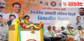 Team Sattavedh Campaign BJP among every caste and religion: वैद्यकीय आघाडीच्या संमेलनात ऑनलाईन हजेरी, स्थानिक निवडणुकीची तयारी Akola : “समाजातील शेवटच्या घटकापर्यंत सेवा पोहोचवून वैद्यकीय क्षेत्राचा लाभ सर्वसामान्यांपर्यंत पोहोचवण्यासाठी भाजपाची वैद्यकीय आघाडी कार्यरत राहावी. तसेच विदर्भात भारतीय जनता पक्षाचा सर्व जाती-धर्मांमध्ये प्रचार वाढवून पक्षाशी नाते दृढ करण्यासाठी प्रयत्न करावेत. आगामी स्थानिक स्वराज्य संस्थांच्या निवडणुकीत भाजपा … Continue reading Ravindra Chavhan : प्रत्येक जाती-धर्मांमध्ये भाजपचा प्रचार करा, प्रदेशाध्यक्षांचे आवाहन