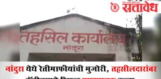 Team Sattavedh sand mafia attacked tehsildar inside the cabin in a life-threatening assault in Nandura : मारहाण करून जीवे मारण्याची धमकी ; महसूल प्रशासनात खळबळ Nandura अवैध रेती वाहतुकीवर कारवाई केल्याचा राग मनात धरून रेतीमाफियाने थेट नांदुरा येथील तहसील कार्यालयात घुसून तहसीलदारांवर प्राणघातक हल्ला केल्याची धक्कादायक घटना घडली. या घटनेने महसूल प्रशासनात भीतीचे वातावरण निर्माण … Continue reading Sand Mafia : नांदुरा येथे रेतीमाफीयांची मुजोरी, तहसीलदारांवर कॅबीनमध्ये शिरून प्राणघातक हल्ला