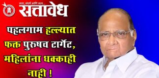 Team Sattavedh Sharad Pawar said I went to Pahalgam two-three months ago : देशवासीयांनी एका विचाराने सरकारसोबत राहिले पाहिजे Sindhudurg : जम्मू – काश्मीरमधील पहलगाम येथे पर्यटकांवर झालेला हल्ला हा इंटेलिजन्स फेल्युअर आहे. तेथील इतर स्थानांपेक्षा पहलगाम हे सुरक्षीत आहे. आपले लोक तेथे जात असतात. पण दहशतवाद्यांनी त्यांचे उद्दीष्ट्य साध्य केले, असा निष्कर्ष काढला … Continue reading Sharad pawar : पहलगाम हल्ल्यात फक्त पुरुषच टार्गेट, महिलांना धक्काही नाही !