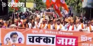 Team Sattavedh ShivSena protest against ST fare hike : अमरावतीत दिला ठिय्या, अकोल्यात सोडली चाकातली हवा Akola Amravati राज्य सरकारने एसटी महामंडळाच्या तिकीट दरात वाढ केली. या निर्णयाविरोधात उद्धव बाळासाहेब ठाकरे गटाच्या शिवसेनेने आक्रमक भूमिका घेतली आहे. राज्यभरातील प्रमुख एसटी डेपोंजवळ मंगळवारी ‘चक्काजाम’ आंदोलन करण्यात आले. अमरावती येथे ठिय्या आंदोलन करण्यात आले. तर अकोला येथील … Continue reading Uddhav Balasaheb Thackeray Shivsena : एसटी भाडेवाढीविरोधात शिवसेनेचा ‘चक्काजाम’