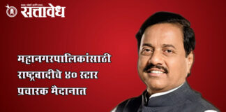 Team Sattavedh State President Sunil Tatkare announced the list : प्रदेशाध्यक्ष सुनिल तटकरे यांनी जाहीर केली यादी… mumbai : राज्यातील २९ महानगरपालिका सार्वत्रिक निवडणुकीसाठी राष्ट्रवादी काँग्रेसने ४० स्टार प्रचारकांची यादी आज जाहीर केली आहे. राष्ट्रवादी काँग्रेसचे प्रदेशाध्यक्ष खासदार सुनिल तटकरे यांनी जाहीर केलेल्या स्टार प्रचारक यादीमध्ये राष्ट्रवादी काँग्रेसचे राष्ट्रीय अध्यक्ष आणि उपमुख्यमंत्री अजितदादा पवार, राष्ट्रीय … Continue reading Star campaigner : महानगरपालिकांसाठी राष्ट्रवादीचे ४० स्टार प्रचारक मैदानात
