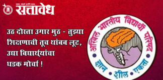 Team Sattavedh ABVP attacks Nagpur University administration : नागपूर विद्यापीठ प्रशासनाच्या विरोधात ABVP चा हल्लाबोल Nagpur : नागपूर विद्यापीठातील वाढती प्रशासकीय अकार्यक्षमता, निकालातील अनियमितता आणि पदभरतीतील विलंबाविरोधात विद्यार्थ्यांमध्ये संताप उफाळून आला आहे. अखिल भारतीय विद्यार्थी परिषद ABVP या प्रश्नांवर आता रस्त्यावर उतरणार आहे. उद्या १३ नोव्हेंबर रोजी सकाळी ११ वाजता राष्ट्रसंत तुकडोजी महाराज नागपूर विद्यापीठाच्या … Continue reading Student agitation : ‘उठ दोस्ता उगार मुठ – तुझ्या शिक्षणाची तूच थांबव लूट’, उद्या विद्यार्थ्यांचा धडक मोर्चा !