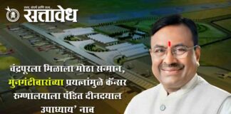 Team Sattavedh Chief Minister’s immediate approval of Mungantiwar’s demand: Rs 17 crore approved for Chandrapur Morwa Airport : चंद्रपूरला मिळाला मोठा सन्मान, मुनगंटीवारांच्या प्रयत्नांमुळे कॅन्सर रुग्णालयाला पंडित दीनदयाल उपाध्याय’ नाव Chandrapur : चंद्रपूर जिल्ह्याच्या आरोग्य क्षेत्रात ऐतिहासिक ठरणाऱ्या २८० कोटी रुपयांच्या अत्याधुनिक कॅन्सर रुग्णालयाला ‘पंडित दीनदयाल उपाध्याय कॅन्सर रुग्णालय’ असे नाव देण्यास मुख्यमंत्री देवेंद्रजी फडणवीस … Continue reading Sudhir Mungantiwar: मुनगंटीवारांच्या मागणीला मुख्यमंत्र्यांची तात्काळ मान्यता : चंद्रपूर मोरवा विमानतळासाठी १७ कोटींची मंजूरी