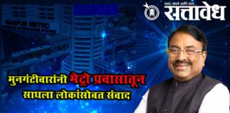 Team Sattavedh MLA Sudhir Mungantiwar travelled by metro to reach Prime Minister Narendra Modi’s event venue : पंतप्रधान नरेंद्र मोदींच्या कार्यक्रमस्थळी जाण्यासाठी केला मेट्रोतून प्रवास Nagpur : पंतप्रधान नरेंद्र मोदी यांच्या हस्ते आज नागपुरात माधव नेत्रालयाच्या नवीन प्रकल्पाचे भूमिपूजन पार पडले. पंतप्रधानांच्या आगमनामुळे नागपुरात अभूतपूर्व अशी सुरक्षा व्यवस्था तैनात करण्यात आली होती. एसपीजी (Special … Continue reading Sudhir Mungantiwar : मुनगंटीवारांनी मेट्रो प्रवासातून साधला लोकांसोबत संवाद