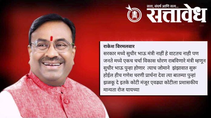 सावली (जिल्हा चंद्रपूर)येथील राकेश विरमलवार या चाहत्याने सुधीर मुनगंटीवार पुन्हा मंत्री व्हावे, यासाठी बाप्पाला प्रार्थना केली. तशी प्रतिक्रिया सोशल मिडियावर कमेंटच्या माध्यमातून त्यांनी टाकली आहे. यामध्ये ‘सरकारमध्ये सुधीर भाऊ मंत्री नाहीत, हे वाटतच नाही. पण जनतेमध्ये एकच चर्चा आहे की, विकास धोरण राबवणारे मंत्री म्हणून सुधीर भाऊच पुन्हा मंत्री होणार. त्याच जोमाने पुन्हा झंजावात सुरू होईल, हीच गणेचरणी प्रार्थना. इतके कोटी मंजूर, तितके कोटी मंजूर, अशा बातम्या पुन्हा झळकू दे. ते मंत्री असताना जिल्ह्याच्या विकासासाठी मोठा निधि यायचा, तो तसाच कायम रहावा यासाठी सुधीर मुनगंटीवार मंत्री आवश्यक आहे…’ असा उल्लेख करण्यात आला आहे.