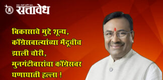 Team Sattavedh Mungantiwar gave a message of political friendship : बल्लारपूर येथे रेणुका दुधे यांच्या प्रचारसभेत विकासकामांची यादी मांडत काँग्रेसवर टीकेचा भडीमार Ballarpur – Chandrapur : नगराध्यक्षपदासाठी भारतीय जनता पक्षाच्या उमेदवार रेणुका दुधे यांच्या प्रचारार्थ काल १ डिसेंबर रोजी झालेल्या जाहीर सभेत राज्याचे माजी मंत्री व आमदार सुधीर मुनगंटीवार यांनी काँग्रेसवर तीव्र टीकेची झोड उठवली. … Continue reading Sudhir Mungantiwar : विकासाचे मुद्दे शून्य, काँग्रेसवाल्यांच्या मेंदूचीच झाली चोरी, मुनगंटीवारांचा काँग्रेसवर घणाघाती हल्ला !
