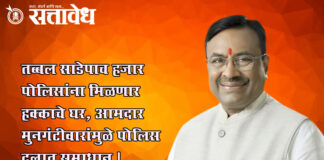 Team Sattavedh Police thanked MLA Sudhir Mungantiwar, while Mungantiwar thanked Chief Minister Devendra Fadnavis : पोलिसांनी मानले आमदार सुधीर मुनगंटीवार यांचे आभार तर मुनगंटीवारांनी दिले मुख्यमंत्र्यांना धन्यवाद Chandrapur : राज्यातील हजारो पोलीस अंमलदारांच्या हक्काच्या घराचे स्वप्न अखेर साकार होणार आहे. राज्याचे माजी मंत्री, आमदार सुधीर मुनगंटीवार यांच्या सातत्यपूर्ण आणि ठाम पाठपुराव्यामुळे शासनाने डीजे लोन योजनेसाठी … Continue reading Sudhir Mungantiwar : तब्बल साडेपाच हजार पोलिसांना मिळणार हक्काचे घर, आमदार मुनगंटीवारांमुळे पोलिस दलात समाधान !