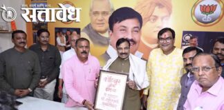 Team Sattavedh A Devoted Fan Honors Sudhir Mungantiwar with a Unique Present : मुनगंटीवारांच्या विकासकार्यावर प्रभावित Chandrapur : राज्याचे माजी मंत्री आमदार सुधीर मुनगंटीवार यांना नुकतेच लंडनमध्ये ‘कोहिनूर ऑफ इंडिया’ या सन्मानाने लोकमत समुहातर्फे गौरवण्यात आले. त्यानंतर आज (२९ ऑगस्ट) त्यांचे बल्लारपूर येथे प्रथम आगमन झाले. यावेळी भाजपचे जिल्हाध्यक्ष हरीष शर्मा यांच्या वाढदिवसाचे औचित्य साधून … Continue reading Unique Honor : सुधीर मुनगंटीवार यांचा असाही चाहता, दिली अनोखी भेट !