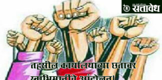 Team Sattavedh Farmers protest on the roof of the tehsil office : दुष्काळी अनुदान रखडल्याने संतप्त निदर्शने Malkapur राज्य शासनाने जाहीर केलेले दुष्काळी अनुदान रखडल्याच्या निषेधार्थ स्वाभिमानी शेतकरी संघटनेने मलकापूर तहसील कार्यालयाच्या छतावर थेट चढून अनोखे आंदोलन छेडले. जिल्हाध्यक्ष नीलेश नारखेडे यांच्या नेतृत्वाखाली झालेल्या या आंदोलनामुळे तहसील कार्यालय परिसरात मोठी खळबळ उडाली. मुख्यमंत्र्यांनी जाहीर केलेल्या … Continue reading Vidarbha Farmers : तहसील कार्यालयाच्या छतावर स्वाभिमानींचे आंदोलन!