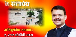 Team Sattavedh Chief Minister Fadnavis announcement to provide relief to farmers : शेतकऱ्यांना दिलासा देण्यासाठी मुख्यमंत्री फडणवीस यांची घोषणा Mumbai : राज्यात सुरू असलेल्या अतिवृष्टीने शेतकऱ्यांचे मोठे नुकसान झाले आहे. आतापर्यंत ९७५.५ मिमी पावसाची नोंद झाली असून हा सरासरीपेक्षा तब्बल १०२ टक्के अधिक पाऊस आहे. या पार्श्वभूमीवर शेतकऱ्यांना दिलासा देण्यासाठी सरकारकडून महत्त्वाची घोषणा करण्यात आली … Continue reading Wet drought : अतिवृष्टीचा तडाखा, २,२१५ कोटींची मदत मिळणार !